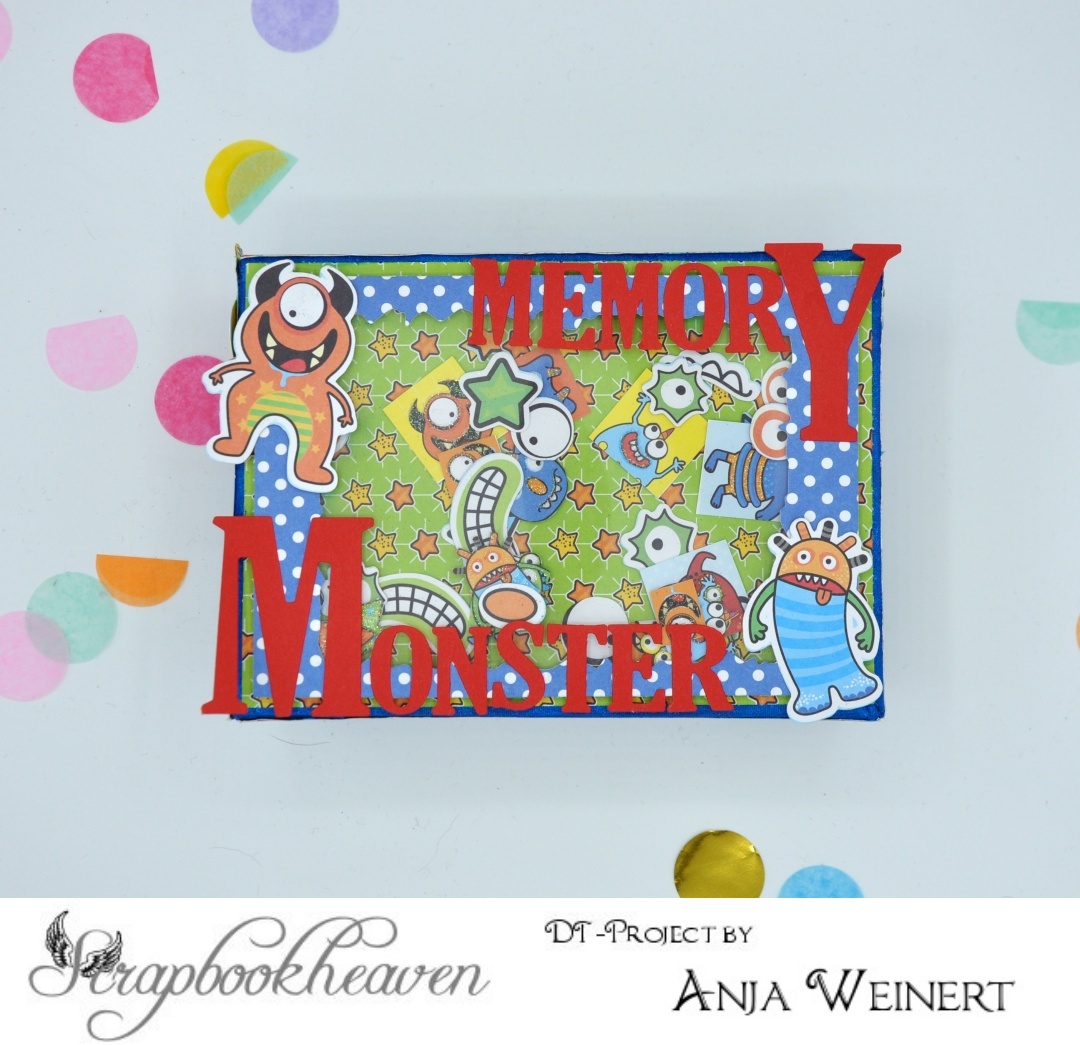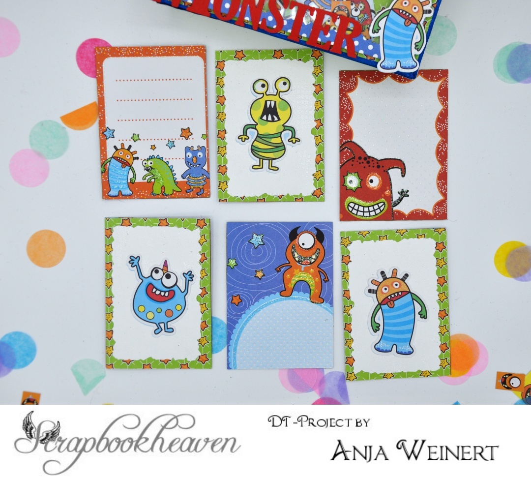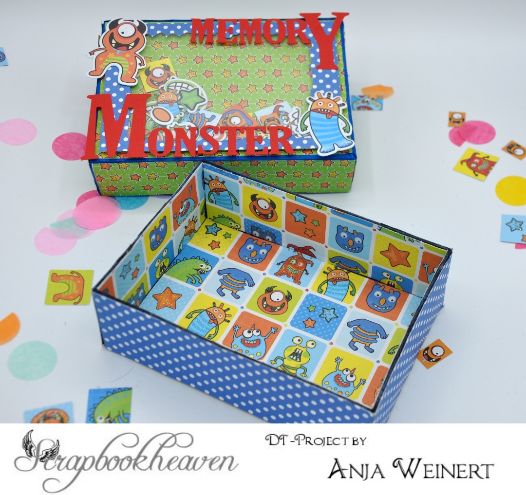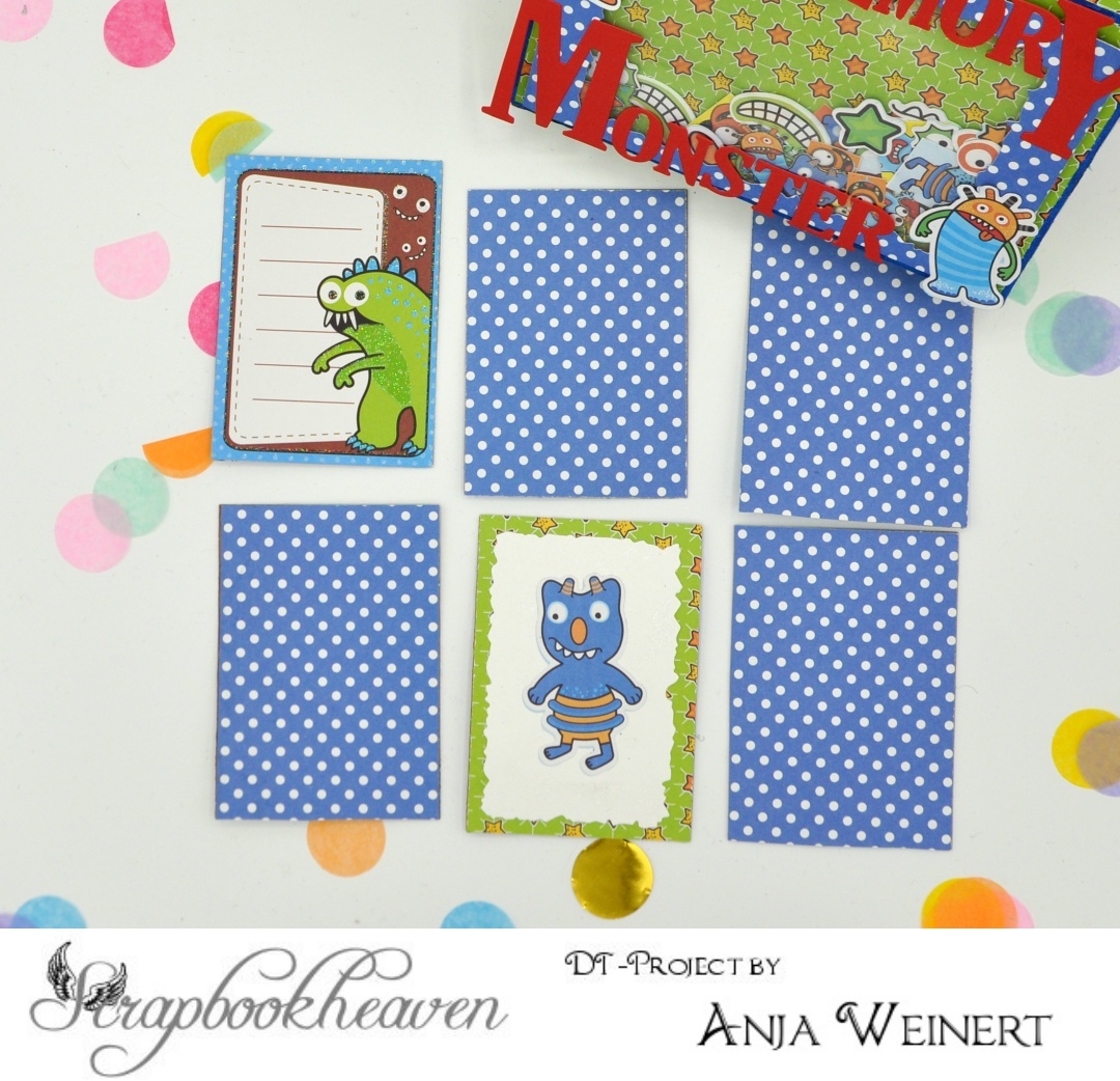 In das süße Monster-Papier habe ich mich sofort verliebt. Und da kam mir die Idee ein Memory-Spiel zu basteln. Zuerst habe ich die Memory-Karten gestaltet, da diese auch am längsten zum trocknen benötigen. Die Größe der Kärtchen des Motivpapiers haben hervorragend gepasst. Um Stabilität zu bekommen, habe ich das Motivpapier sowie die Rückseite auf Kraftkarton aufgeklebt Damit sich keine Wellen bilden, habe ich die fertigen Karten einfach für einige Zeit in Bücher gelegt. Und nicht vergessen: immer zwei Karten von einem Motiv gestalten ;o). Für die Schachtel habe ich Graupappezuschnitte in der passenden Größe geschnitten und die fertige Schachtel dann mit Papier bezogen und verziert. In den Deckel habe ich noch ein Schüttelelement eingebaut.