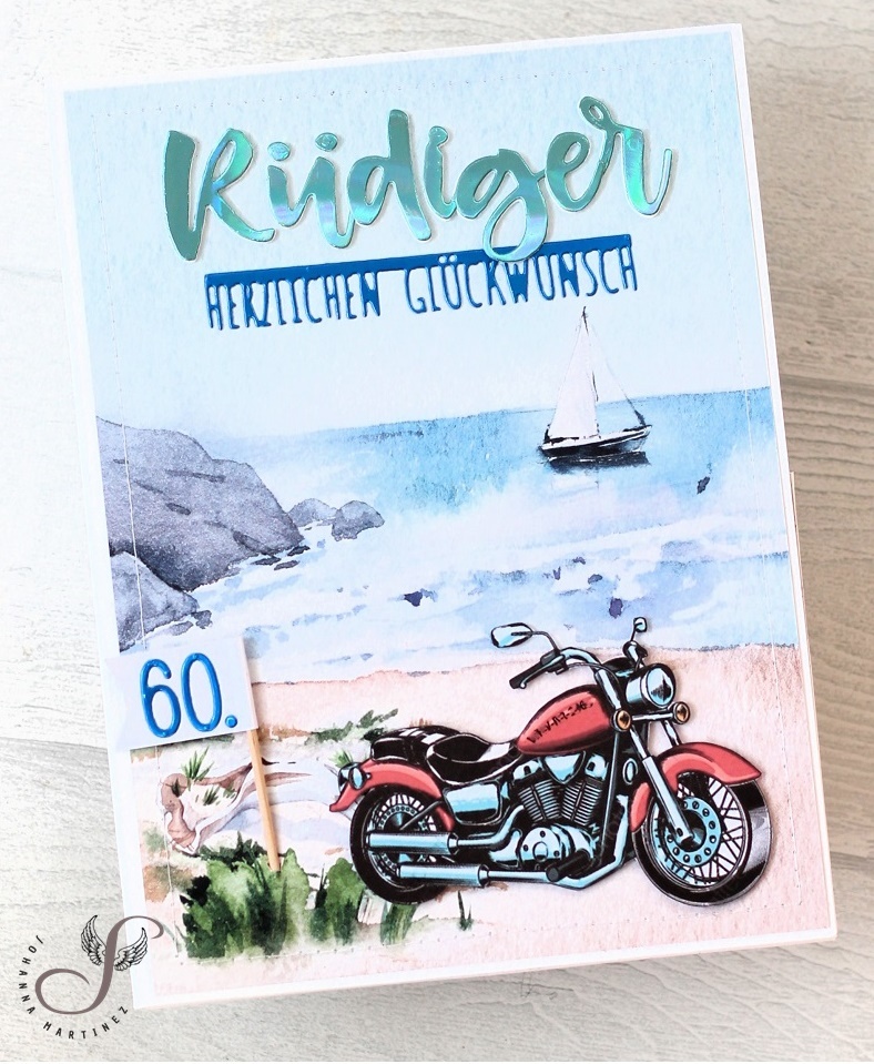 Ich möchte euch eine männliche Geburtstagskarte zum 60. Geburtstag vorstellen. Die Lieblingshobbys des Empfängers sind der Strand und Motorradfahren, also waren sie natürlich das