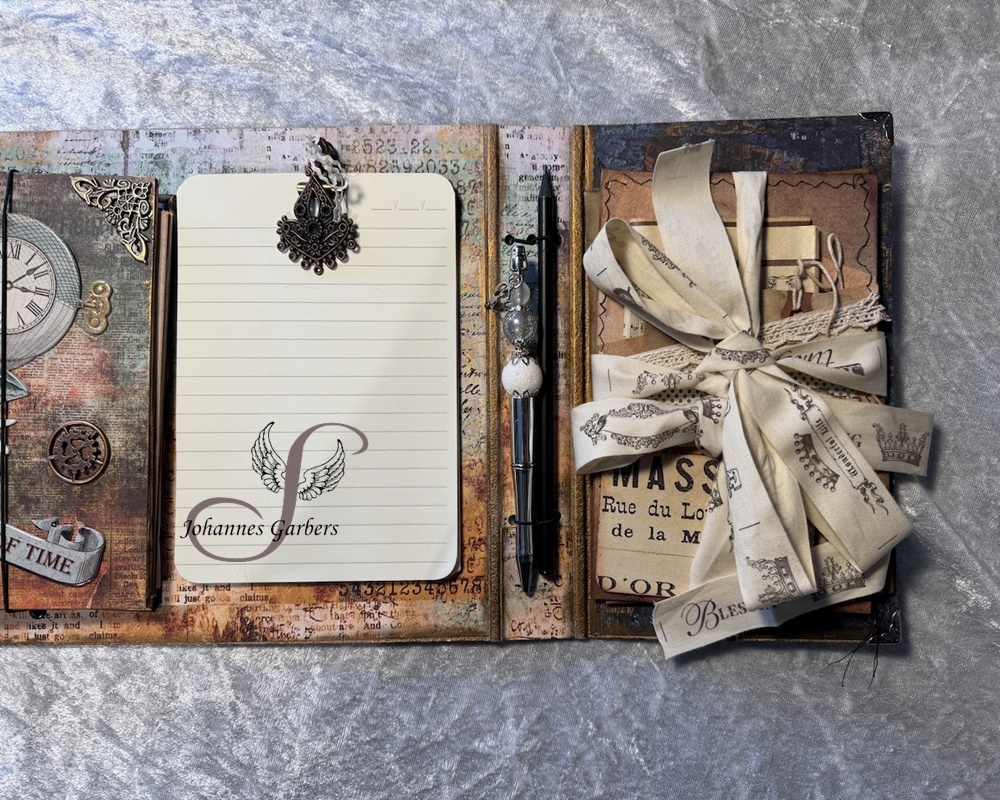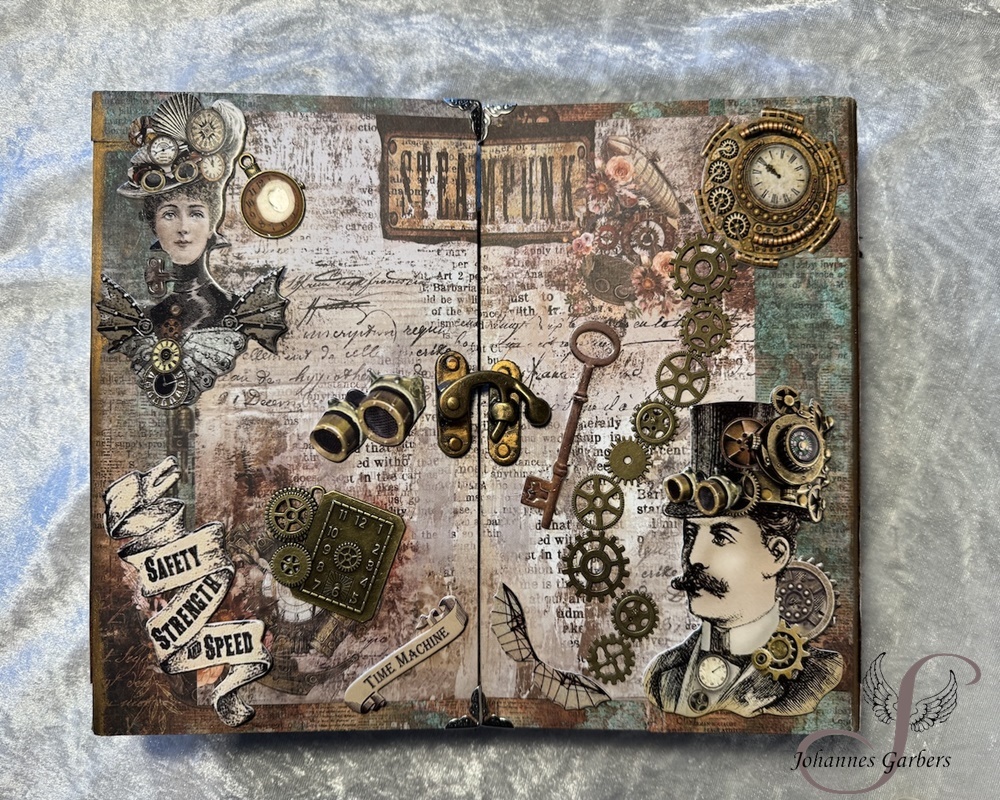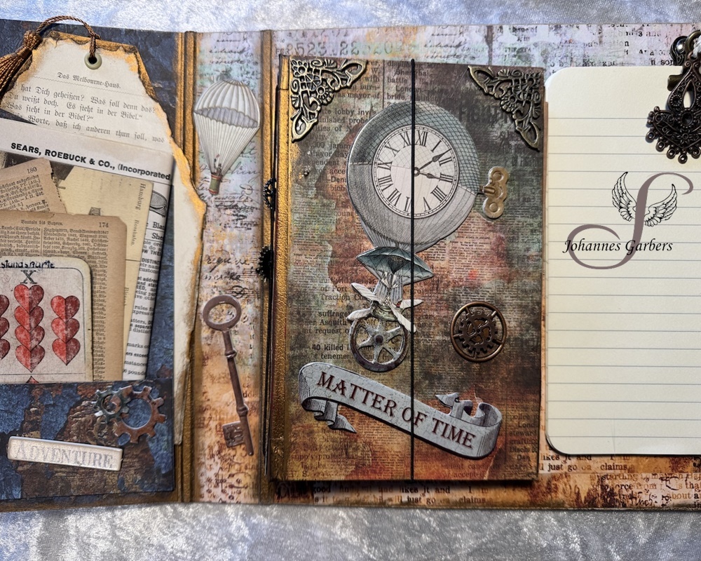 Steampunk geht immer und eine Schreibmappe mit Notizbuch, Stiften, Papier und weiterem Material wie kleinen Tags etc. kann man immer gebrauchen. Ich habe die Graupappe mit Desingpapier von Craft O'Clock beklebt. Anschließend habe ich die Löcher zum Befestigen des Gummibandes mit eine Lochzange gemacht und eine Hohlniete eingequetscht. Das Gummiband habe ich an der Rückseite verknotet und unter dem Knoten ein Metallelement aus eigenem Vorrat befestigt um zu verhindern das der Knoten durch die Löcher rutscht. Innen habe ich eine Klammer für das Notizpapier befesteigt. Für die eine Innenseite habe ich dann noch zwei Einstecktaschen aus Designpapier gemacht und auf der andern Seite habe ich Band zum Befestigen von Material und Briefumschlägen angebracht. Abschließend habe ich noch das Cover verziert.