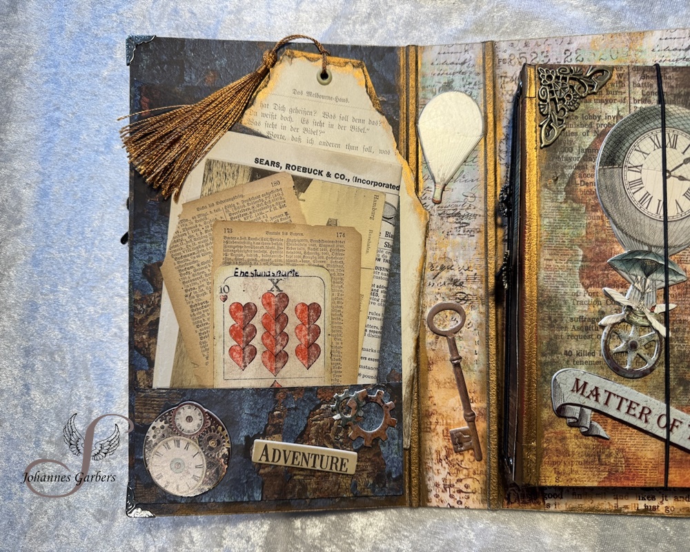 Materialliste: Bucheinband: Scrapbookheaven - Motivpapier: Wings of Freedom von Craft o'Clock - Junk Journal Set: Scrapbookheaven - Die-Cuts, Metallelement und Gummiband: privat