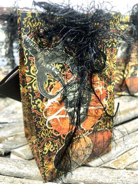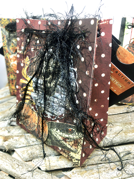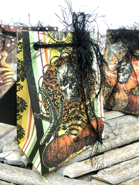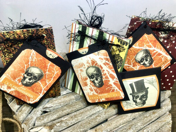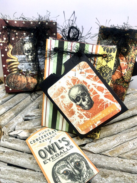 Nun ist bald wieder Halloween! Und es ist eine süße amerikanische Sitte, an diesem Tag kleine Süßigkeitengeschenke an Kinder zu verteilen, die ja mittlerweile auch in Deutschland immer mehr Anklang findet und so habe ich aus Cardstock ein paar kleine Tütchen mit Anhänger gebastelt, natürlich mit furchtbar gruseligen Motiven, das versteht sich von selbst! Die Motive habe ich alle einfach aus dem Papier ausgeschnitten und dann aufgeklebt. Dazu jeweils ein kleiner Anhänger als Tasche, in der ein Gruß verstaut werden kann.