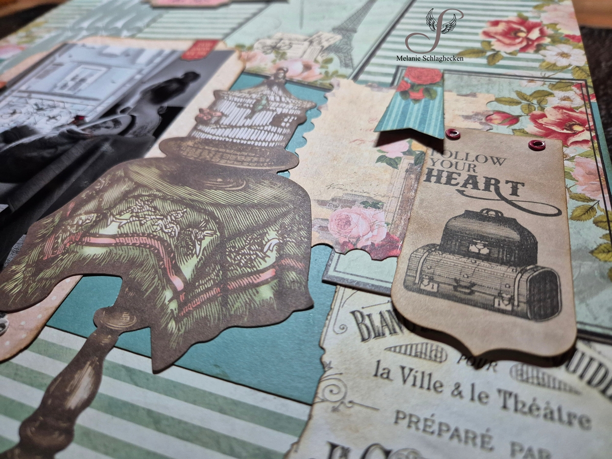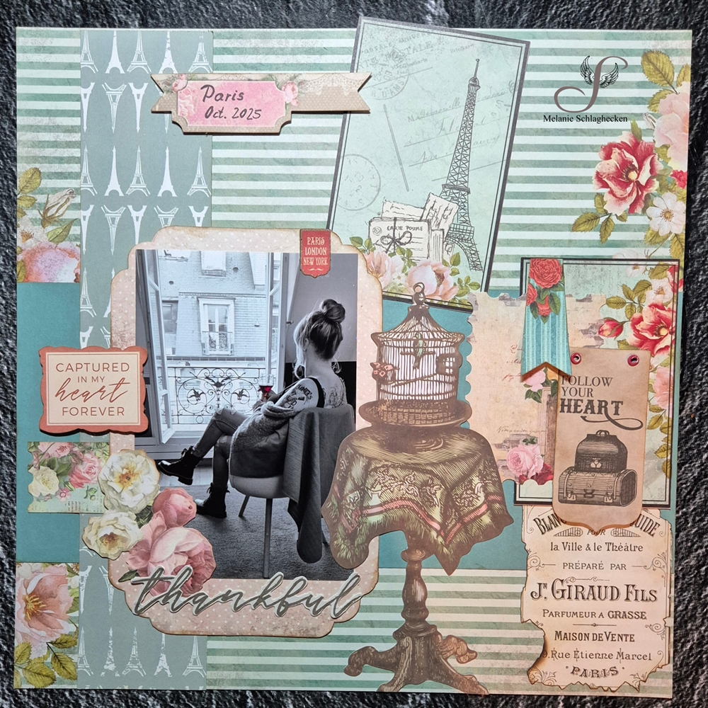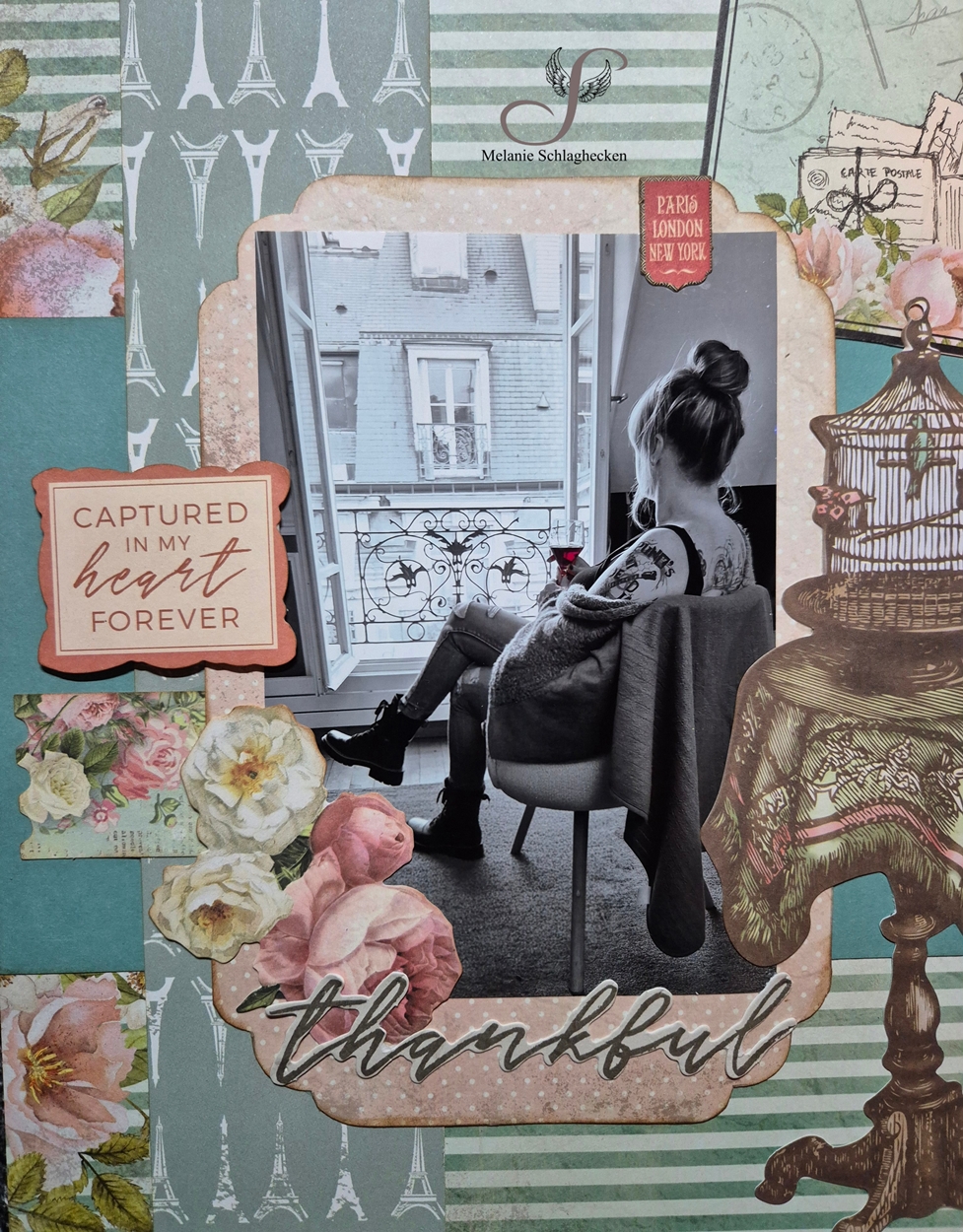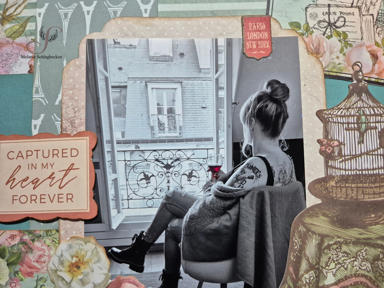 Letztes Jahr im Oktober bin ich ganz spontan mit 2 Kids für einen Kurztrip nach Paris gefahren. Die Erfahrung wird mir lange in Erinnerung bleiben. Wir hatten eine tolle Zeit und haben viele Sehenswürdigkeiten gesehen. Bevor ich mich nun an ein ganzes Album setze, wollte ich vorab schon mal ein einzelnes Layout machen mit einem Foto von mir, mit Blick aus dem Wohnzimmerfenster. Dafür kam das Hintergrundpapier von Laserowe - Vintage Trip - wie gerufen.