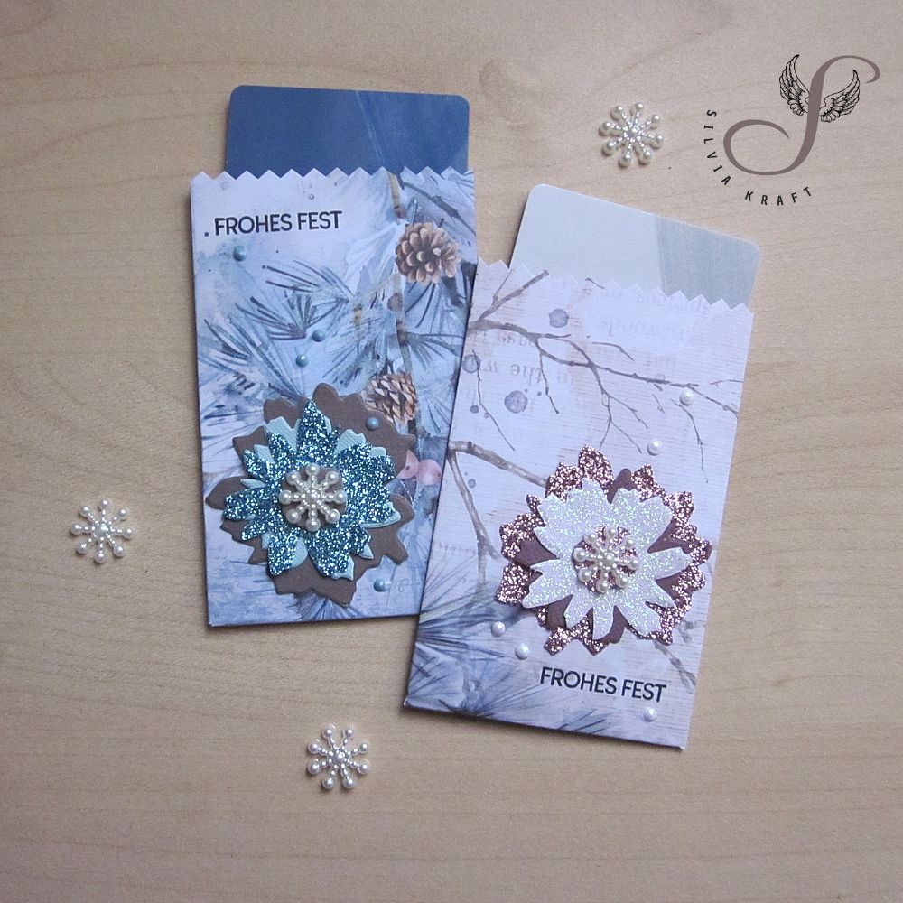 Dieses Jahr habe ich erneut an einem Weihnachtsbasar teilenommen. Da Gutscheine ein häufiges Geschenk sind, habe ich schlichte Gutschein-Verpackungen gebastelt. Die Verpackungen habe ich mit Blüten aus meinem letzten Projekt verziert; die Blüten eignen sich auch hervorragend als weihnachtliche Dekoration und setzen schöne Akzente.